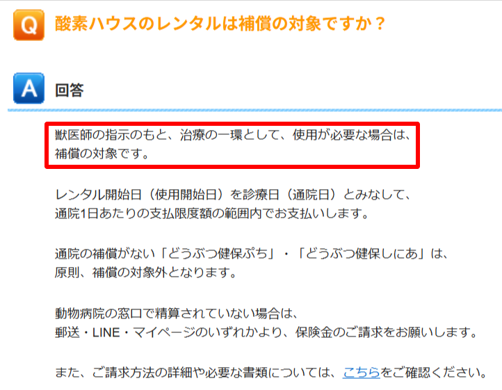 アニコム損害保険の公式サイトでは「レンタル酸素室を獣医師の指示のもと、治療の一環として使用が必要な場合は、補償の対象です」と明記されています。